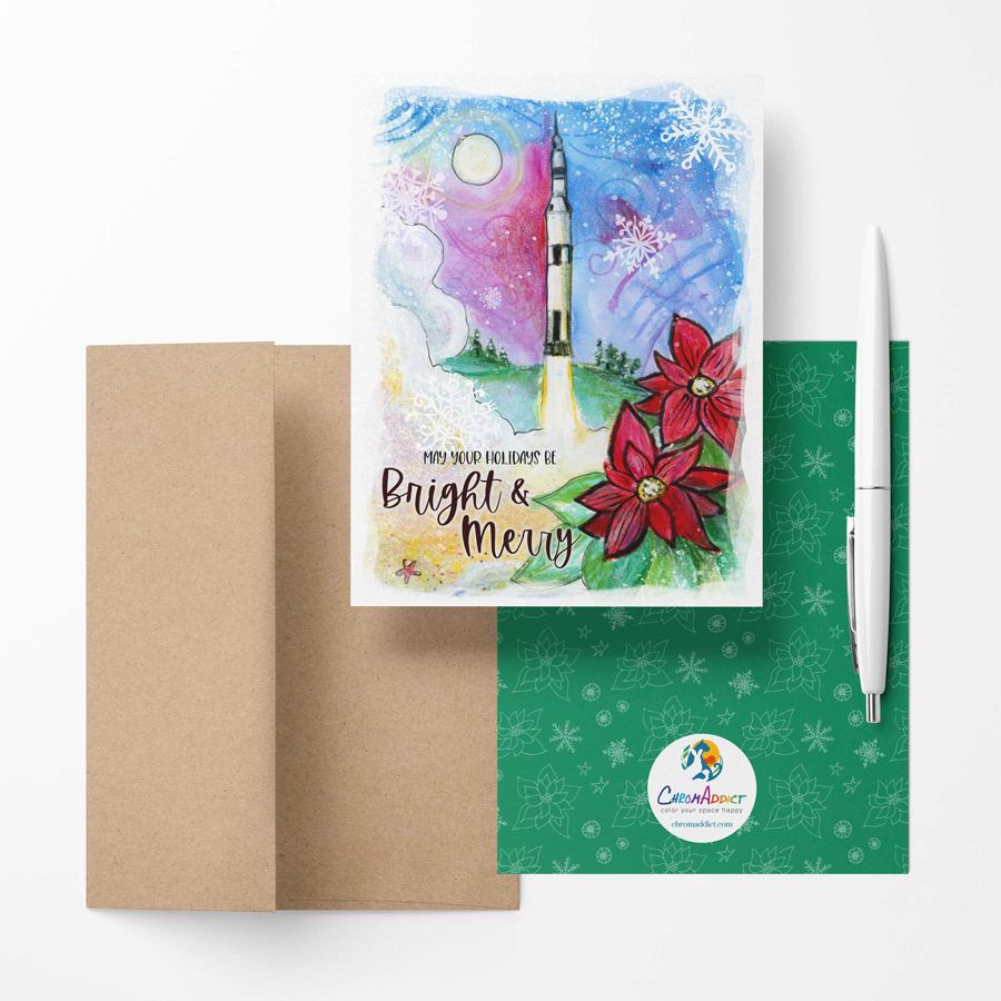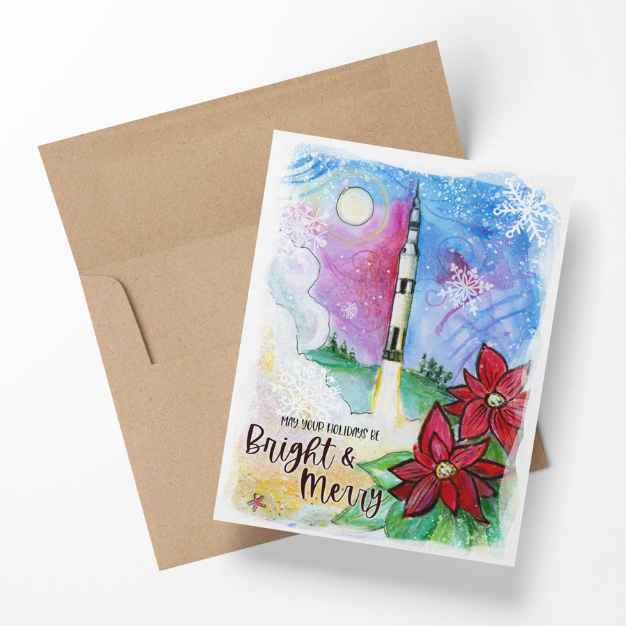 Set of 6 blank note cards and envelopes featuring a Saturn V, the varied landscape of Alabama, and bright red poinsettias. Card has a coordinating pattern on the back. Size of card is 4.25″ x 5.5″ (A2). These come packaged in a clear box making them the perfect gift.