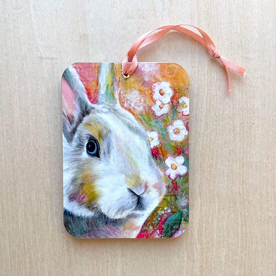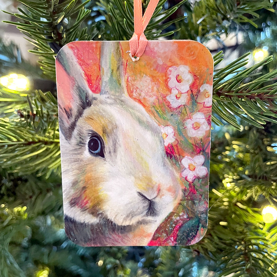 This adorable bunny is waiting patiently for those strawberry blossoms to become strawberries. My original art was created with colored pencils and acrylics. Add this adorable ornament to your tree or gift it to the rabbit lover in your tribe.