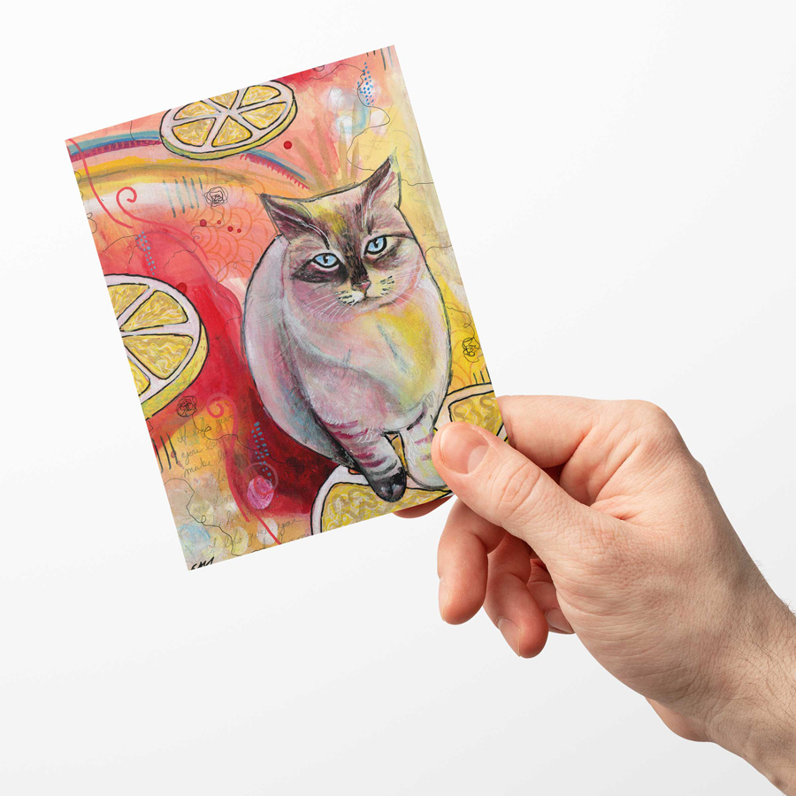 Set of 6 blank note cards and envelopes featuring cats. Card has a coordinating pattern on the back. Size of card is 4.25″ x 5.5″ (A2). These come packaged in a clear box making them the perfect gift.