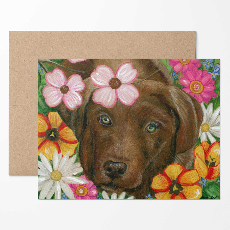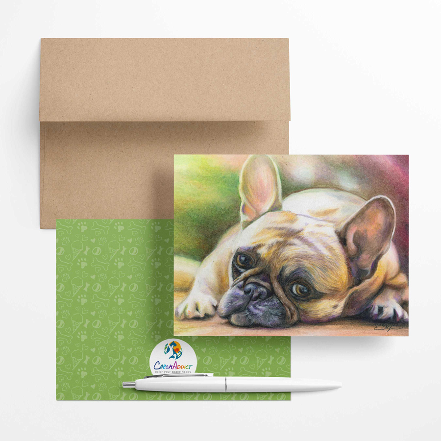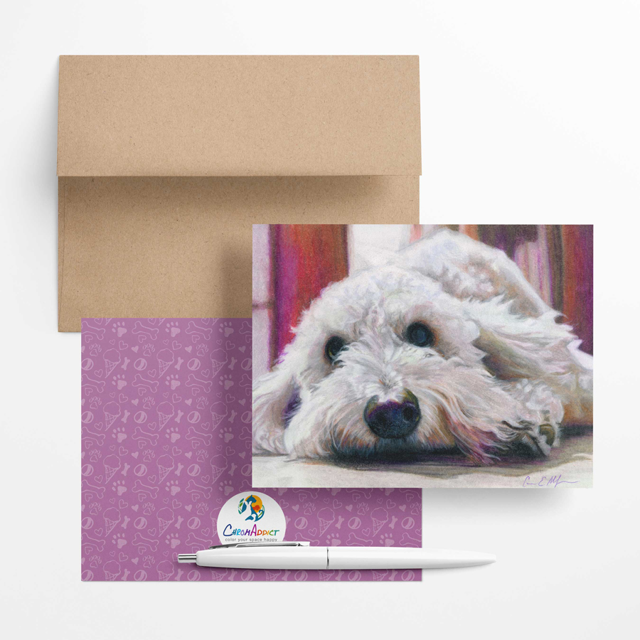 Set of 6 blank note cards and envelopes featuring dogs. Card has a coordinating pattern on the back. Size of card is 4.25″ x 5.5″ (A2). These come packaged in a clear box making them the perfect gift.
