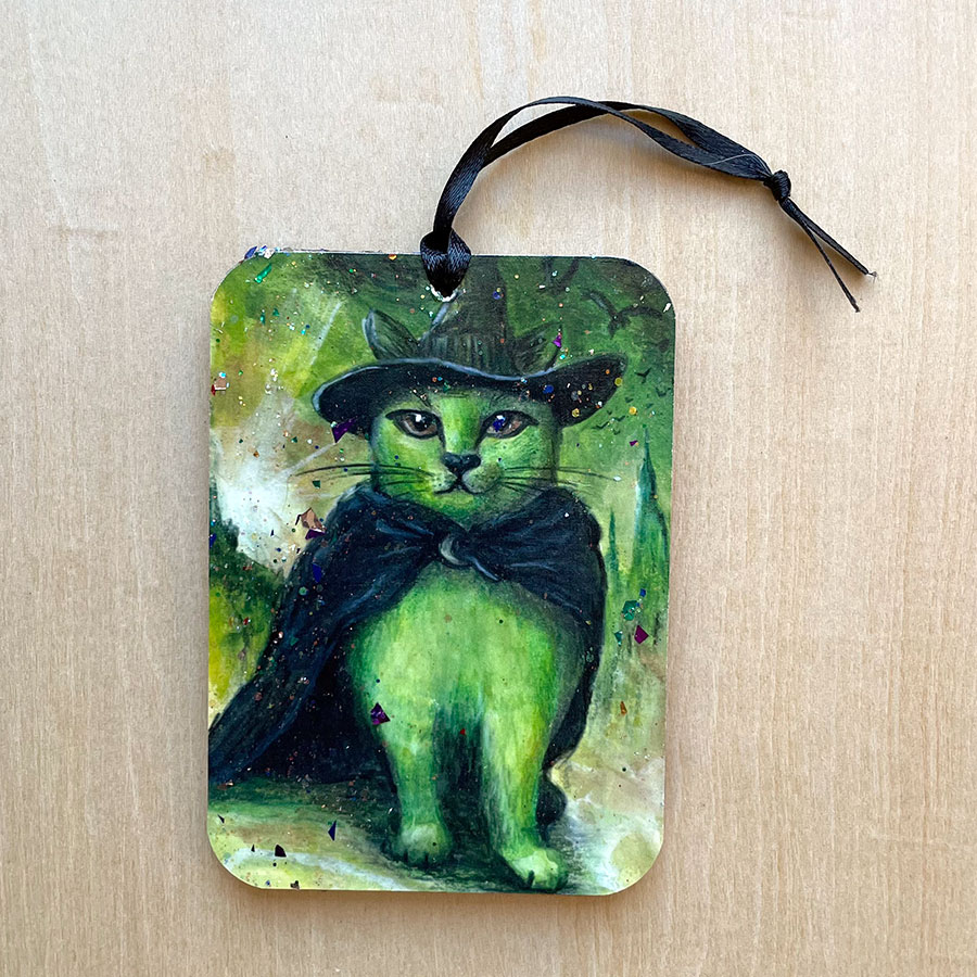 I love cats, and I love combining them with characters. I had so much fun turning Elphaba, the Wicked Witch of the West, into a cat. I created the original art used in this bauble with colored pencils and acrylics. Proclaim your love for all things Wicked with a Elphaba Cat Ornament.