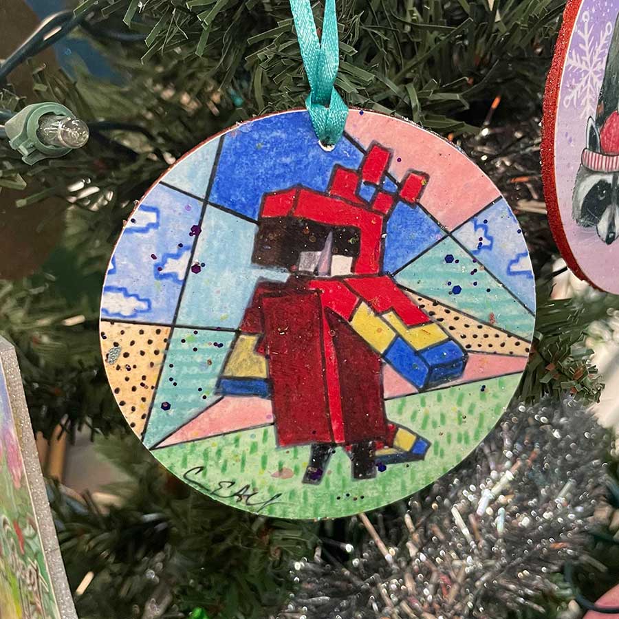 For this ornament I scanned my original art. I then print it with pigment ink and cut out the print with the Cricut. I spray the backs of the wood discs with glitter paint. I use acrylic gel medium to adhere the print to the wood, add glitter, and then seal with a UV spray varnish. Each ornament comes with a coordinating ribbon so it is ready to hang.