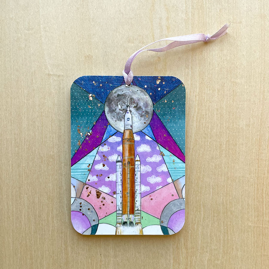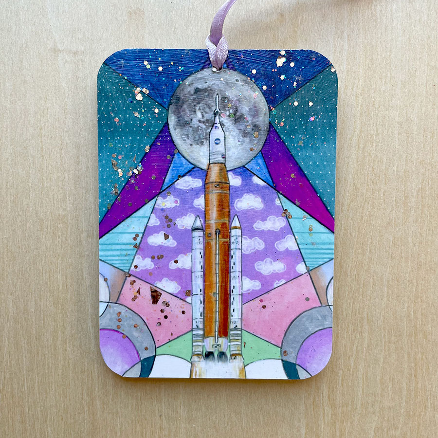 Normally I make the pieces in my space series with a focus on the original art. In this case, I really wanted to make an ornament of the SLS in honor of Artemis 1 mission, so I made an 8×10 original with the plan that it would also be an ornament. The original art for this piece was created with colored pencils, wax crayons, and acrylics.