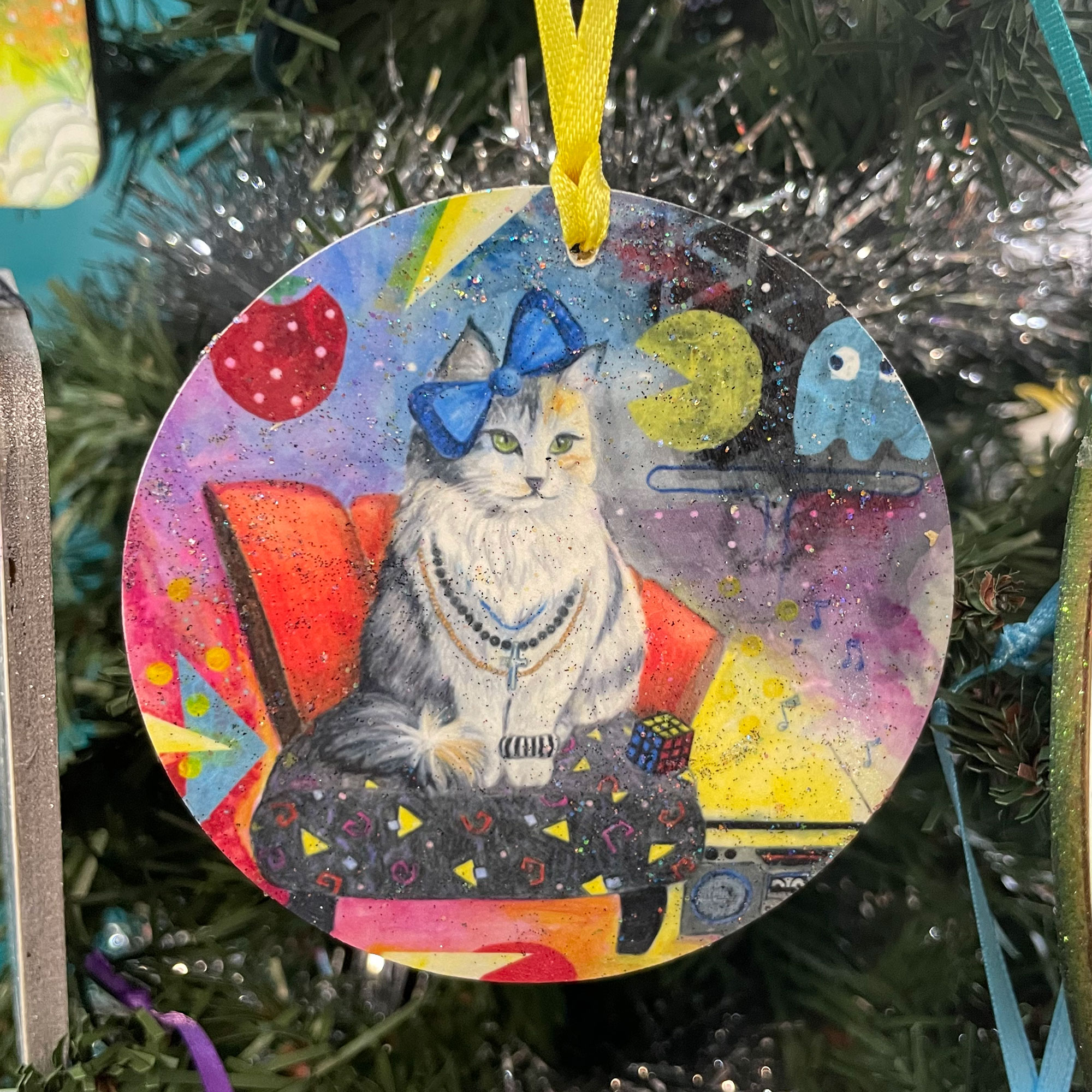 For this ornament I scanned my original art. I then print it with pigment ink and cut out the print with the Cricut. I spray the backs of the wood discs with glitter paint. I use acrylic gel medium to adhere the print to the wood, add glitter, and then seal with a UV spray varnish. Each ornament comes with a coordinating ribbon so it is ready to hang.