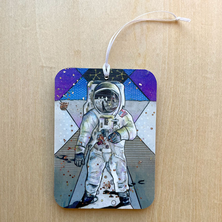 “Smile, Buzz” has been a favorite art print, so I decided to feature it on an ornament this year. It is based on a photo of Buzz Aldrin taken by Neil Armstrong during their first moon landing, The original art for this piece was created with colored pencils, wax crayons, and acrylics.