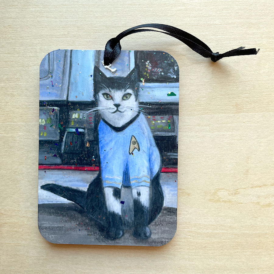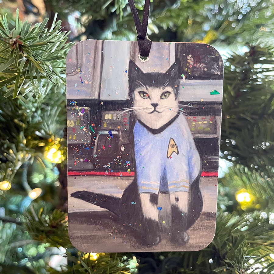 I love cats. And I’ve loved Star Trek since I started watching reruns of the original back when I was in junior high. I had to combine my two loves into one adorable piece of original art. Spock is one of my favorite characters. Proclaim your geekiness with a Spock Cat Ornament.