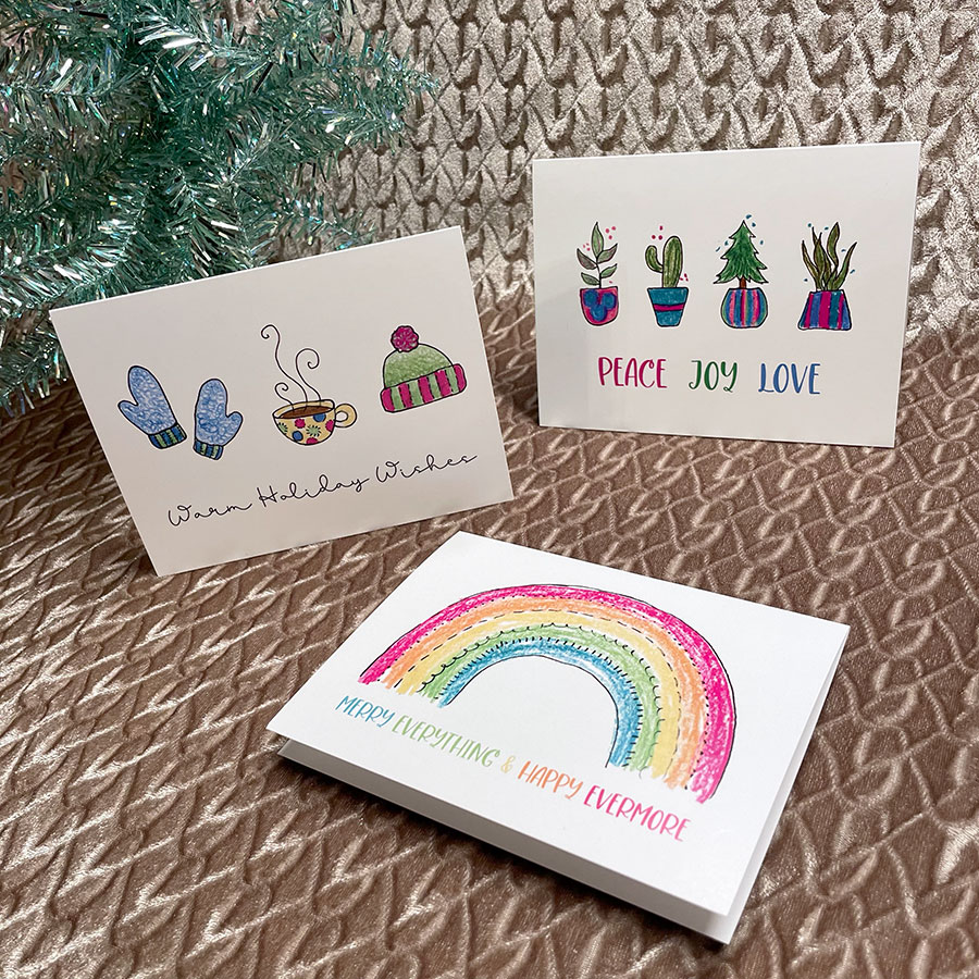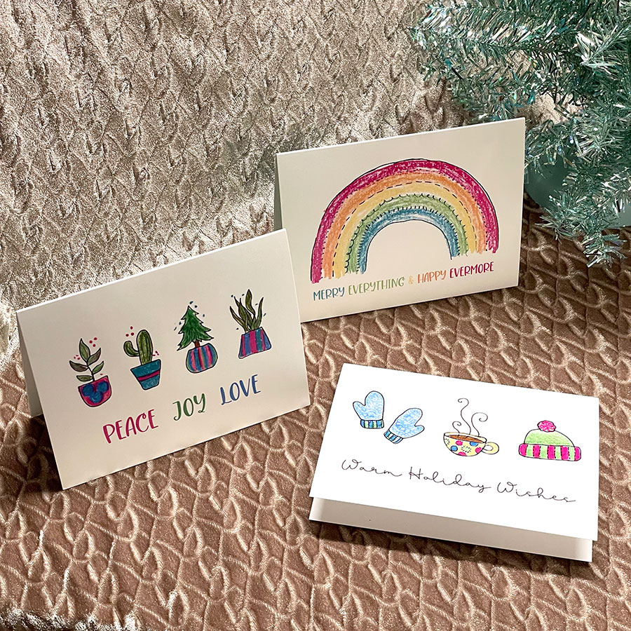 Set of 6 blank note cards and envelopes featuring positive and uplifting Holiday illustrations. Card has a coordinating pattern on the back. Size of card is 4.25″ x 5.5″ (A2). These come packaged in a clear box making them the perfect gift.