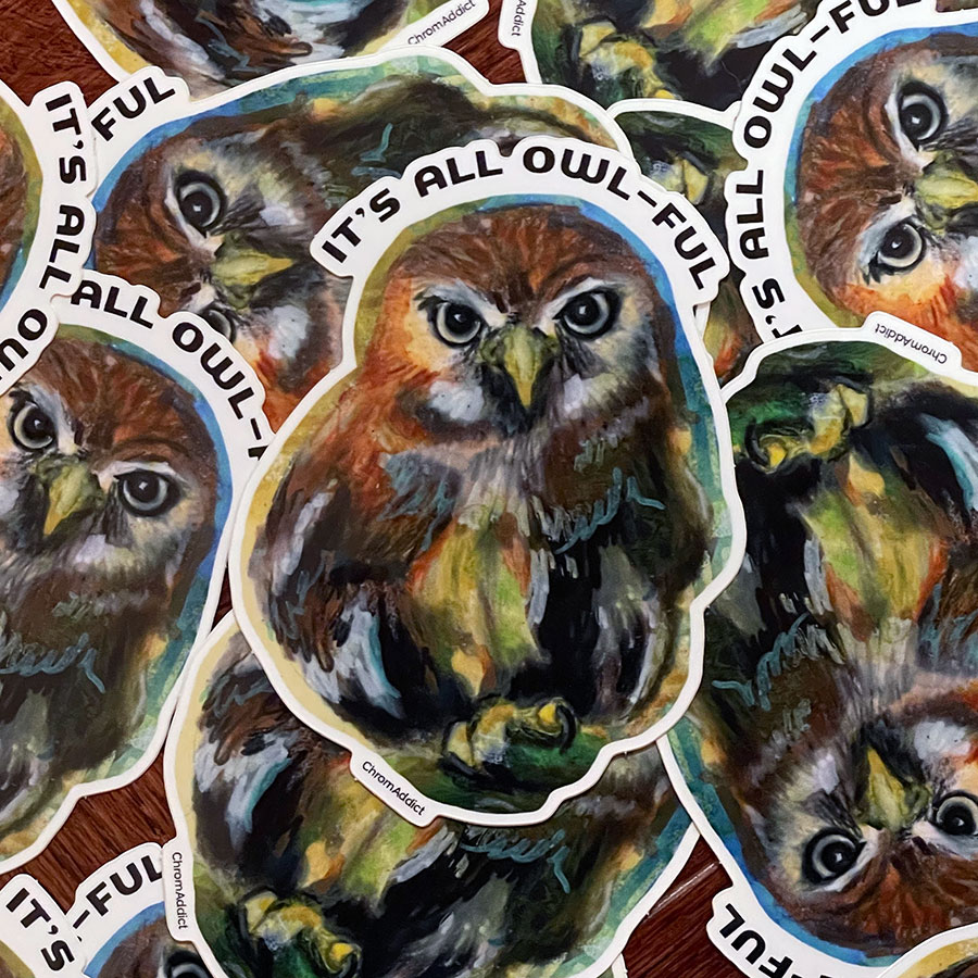 Oh no! This owl is having an owl-ful day and now you can share in his misery – lol. This cute sticker is actually sure to brighten your day. This die-cut sticker is approximately 3.5″ tall x 2.5″ wide.