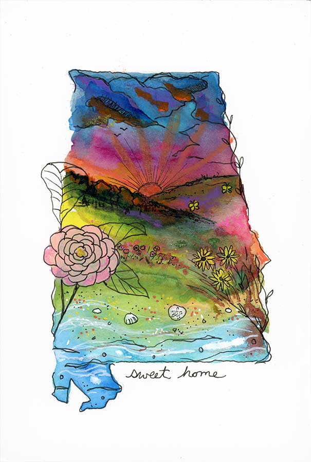 “Sunset Camellia (AL)” is an archival print of original artwork created by Carrie Alderfer. Each print is signed. All works are printed in my Alabama studio on acid-free, hot press watercolor paper with pigment inks.