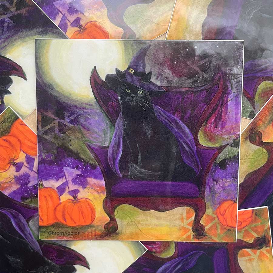 Decorate your stuff with this adorable black cat dressed as a witch. Witch Cat is part of the “Chairished Cats” collection. This square sticker measures 3″ x 3″.